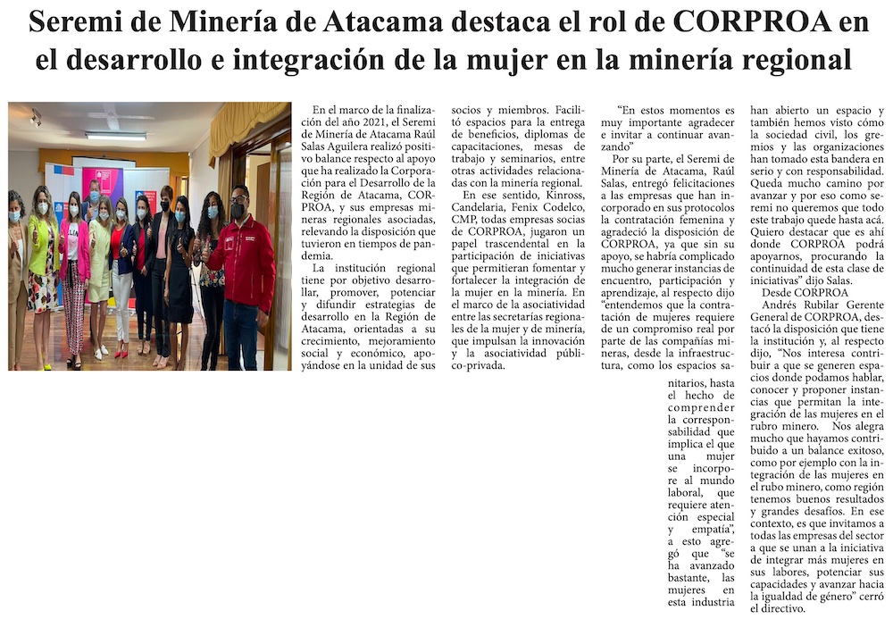 Seremi de Minería destacó a Corproa en integración de la mujer - (El Diario de Atacama)