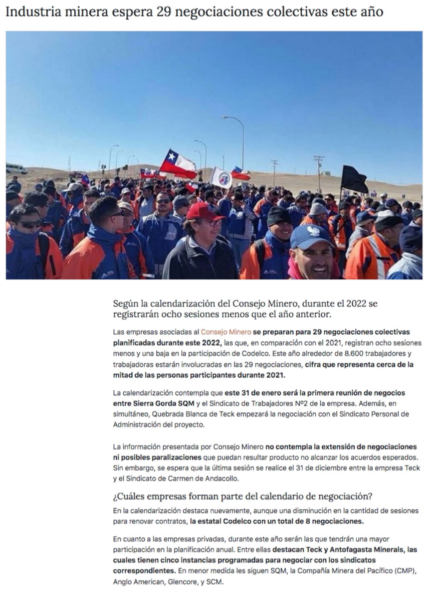 Sector minero se prepara para las 29 negociaciones colectivas que enfrentará el 2022 - (chilemineria.cl)