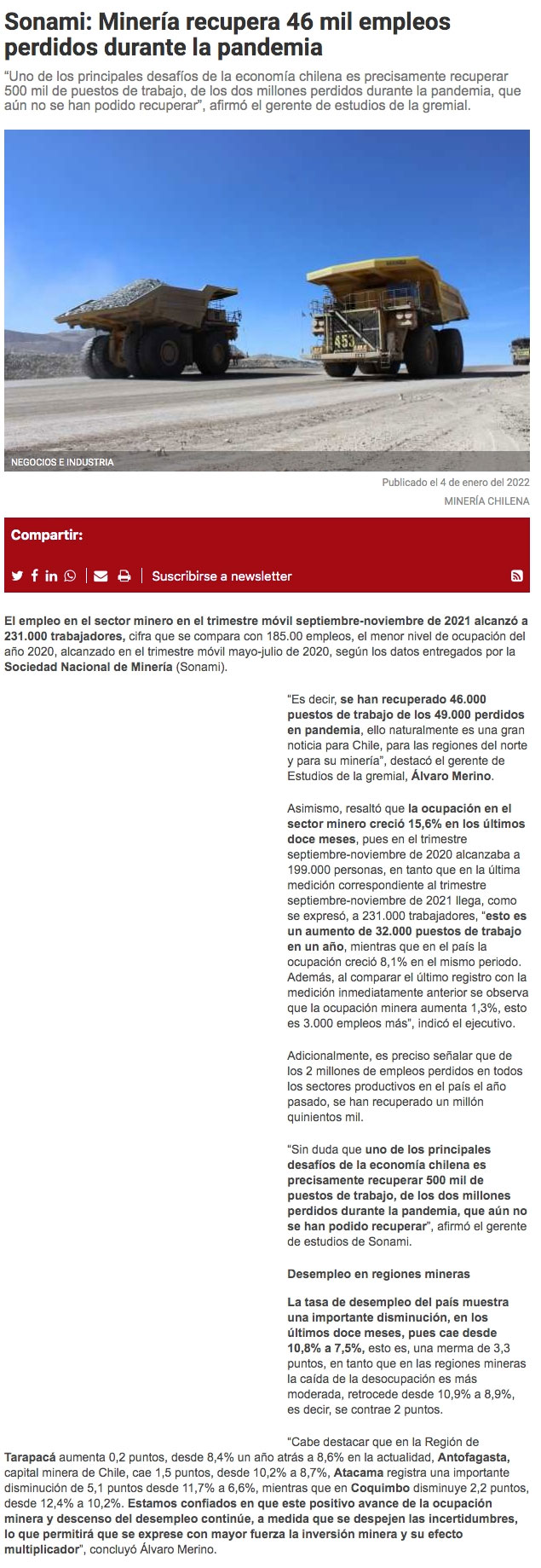 Sonami: Minería recuperó 46 mil empleos y está cerca de cifras antes de la pandemia - (norteminero online)