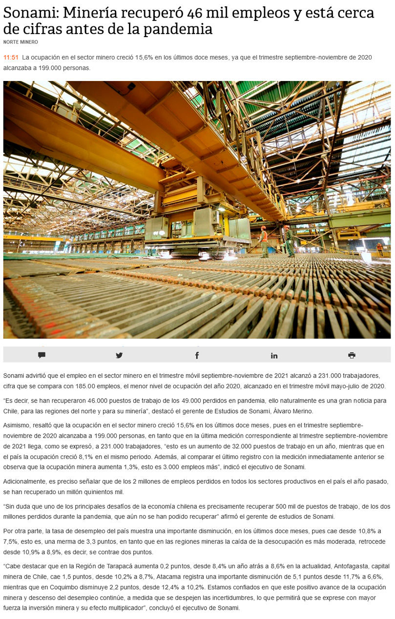 Sonami: Minería recupera 46 mil empleos perdidos durante la pandemia - (mch.cl)