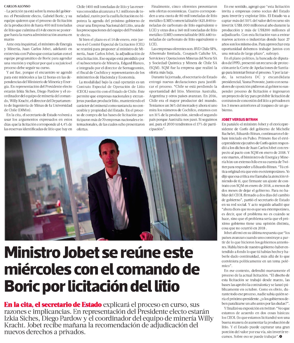 Licitación del litio: equipo de Boric se reúne hoy con Jobet y diputados llegan a la justicia - (Diario Financiero)