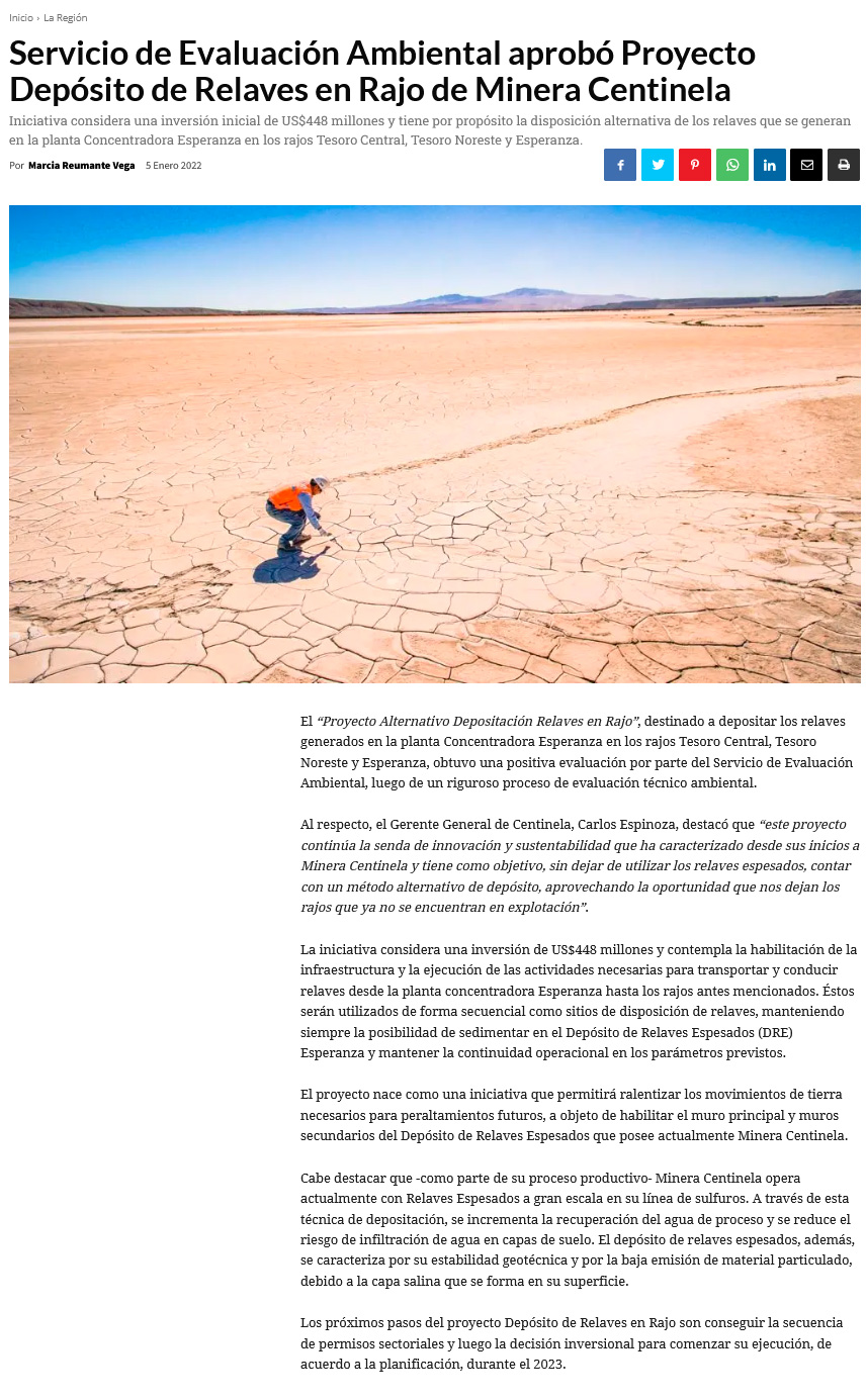 SEA aprueba proyecto en Minera Centinela - (El Mercurio de Santiago)