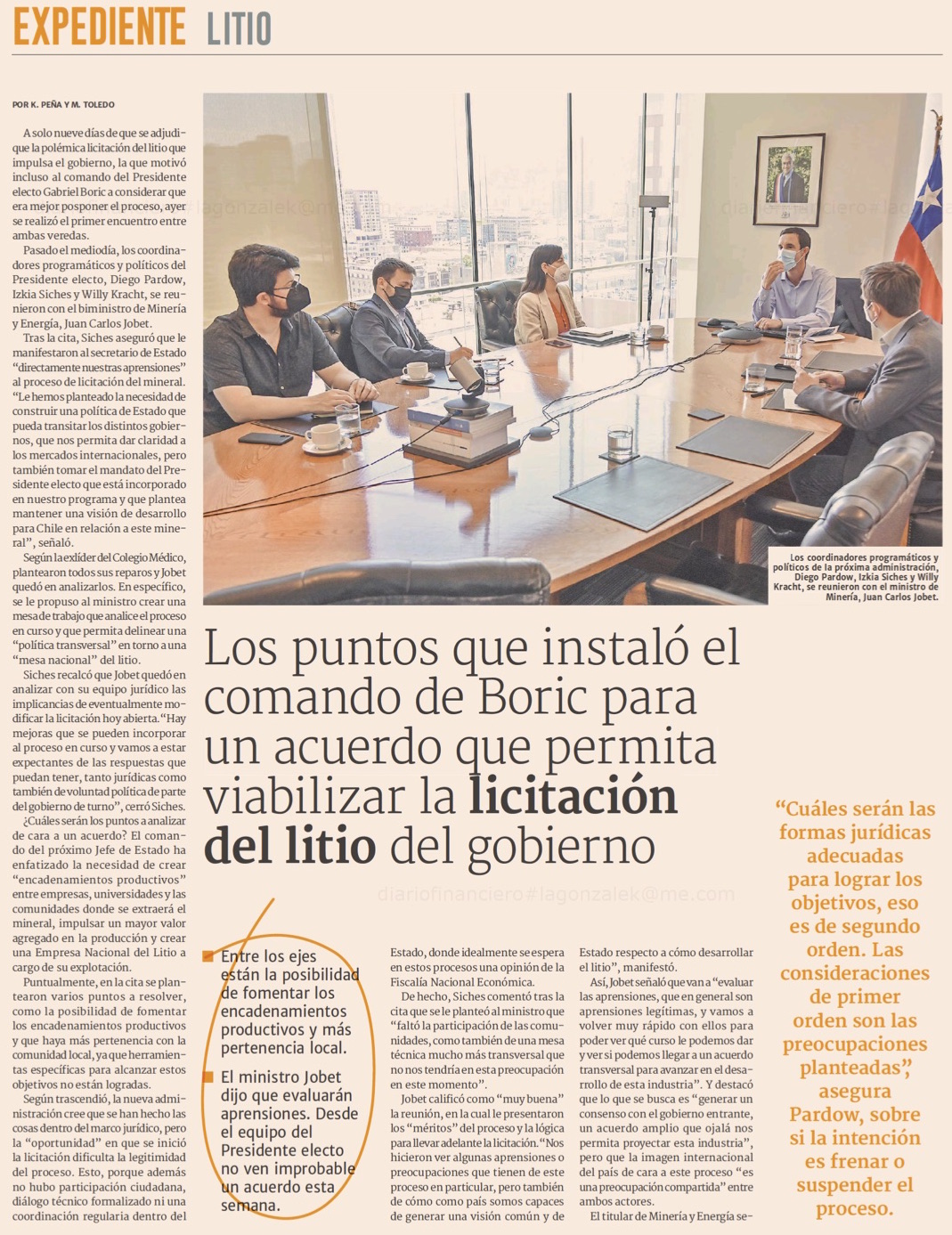 Gobierno y equipo de Boric buscarán “acuerdo amplio” para impulsar industria del litio - (El Mercurio de Santiago)