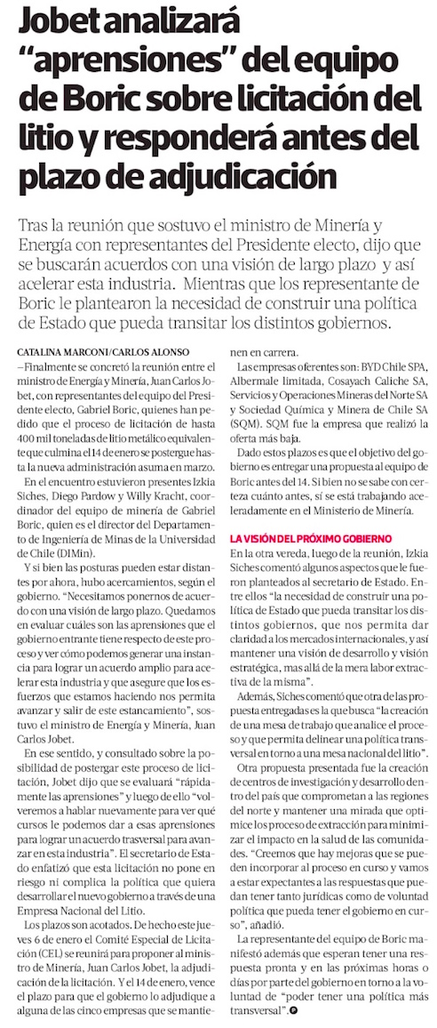 Gobierno y equipo de Boric buscarán “acuerdo amplio” para impulsar industria del litio - (El Mercurio de Santiago)