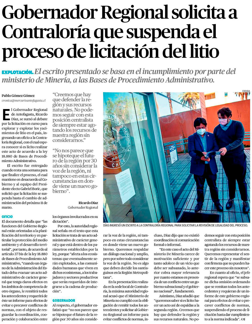 Gobernador de Antofagasta ingresó oficio a Contraloría por licitación del litio - (cooperativa online)