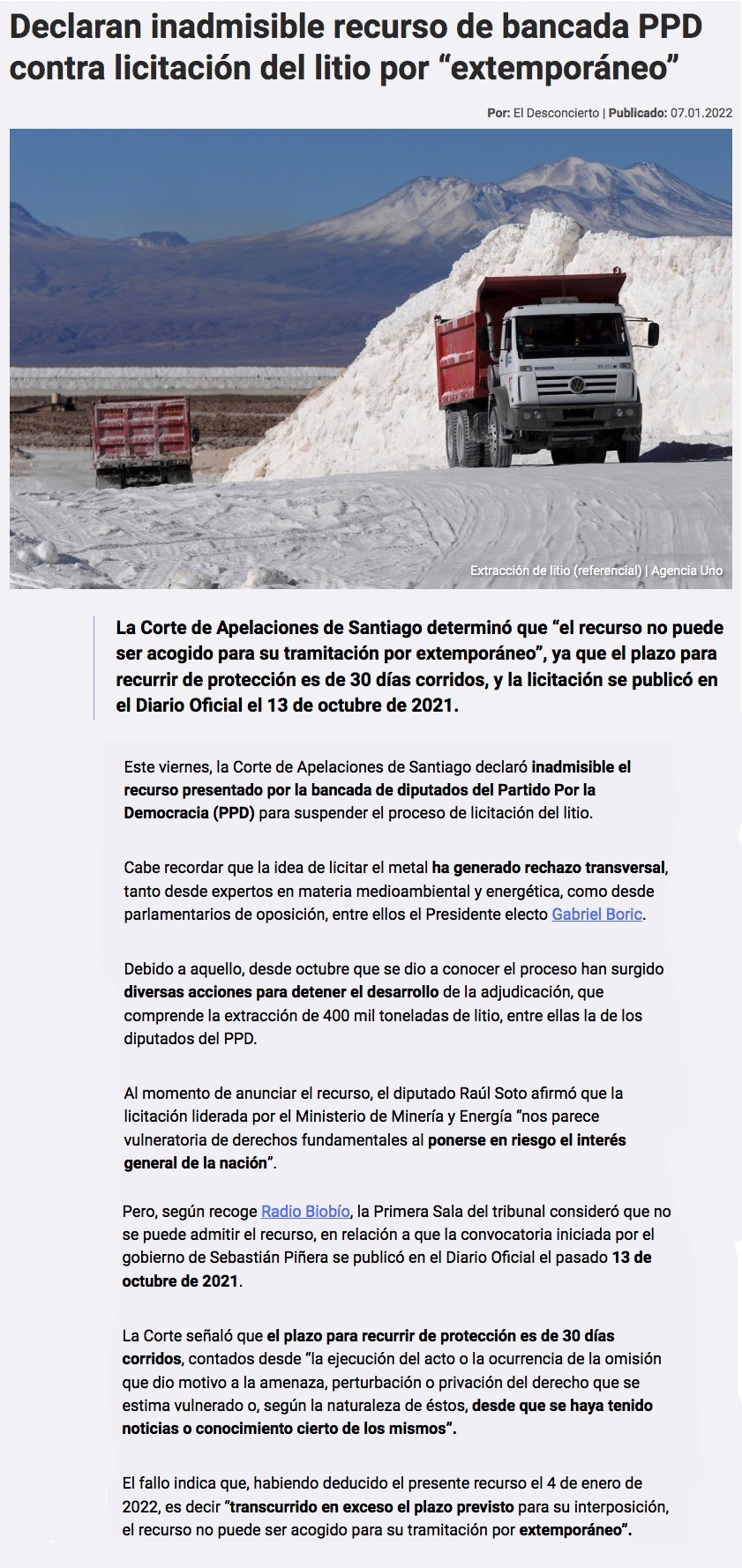 Corte de Apelaciones rechaza recurso de protección que buscaba paralizar licitación de nuevos contratos de litio - (DF Online)