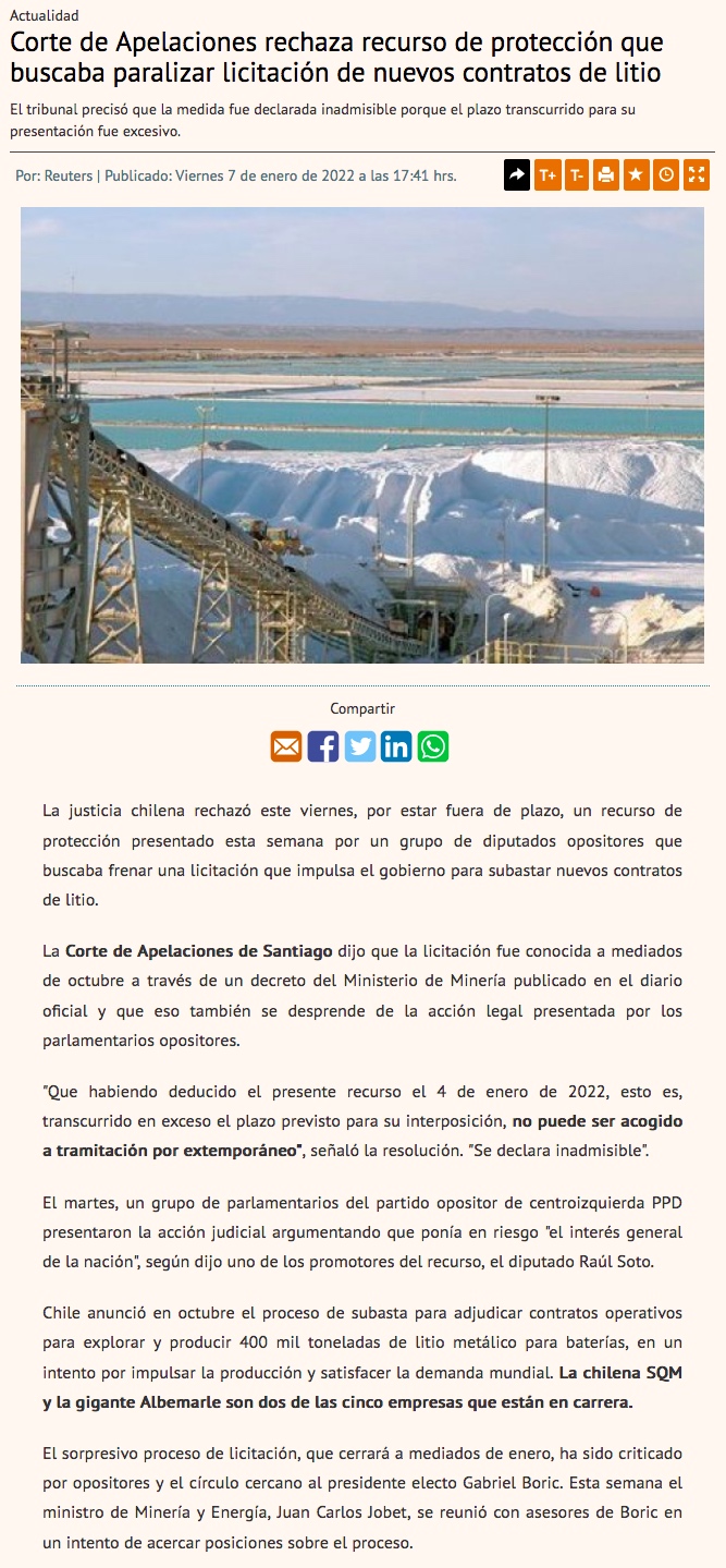 Justicia chilena rechaza el recurso que buscaba paralizar la licitación de nuevos contratos de litio. - (americaeconomia online)