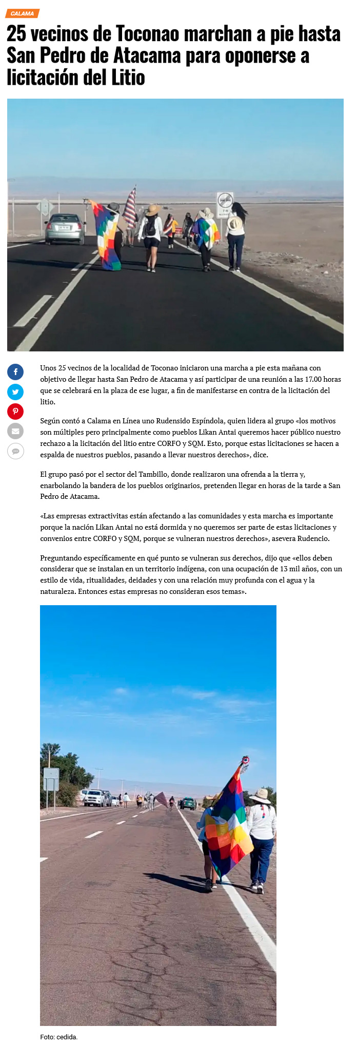 Comunidades lickanantay marcharon 44 kilómetros en rechazo a la adjudicación de explotación del litio - (El Mercurio de Antofagasta)