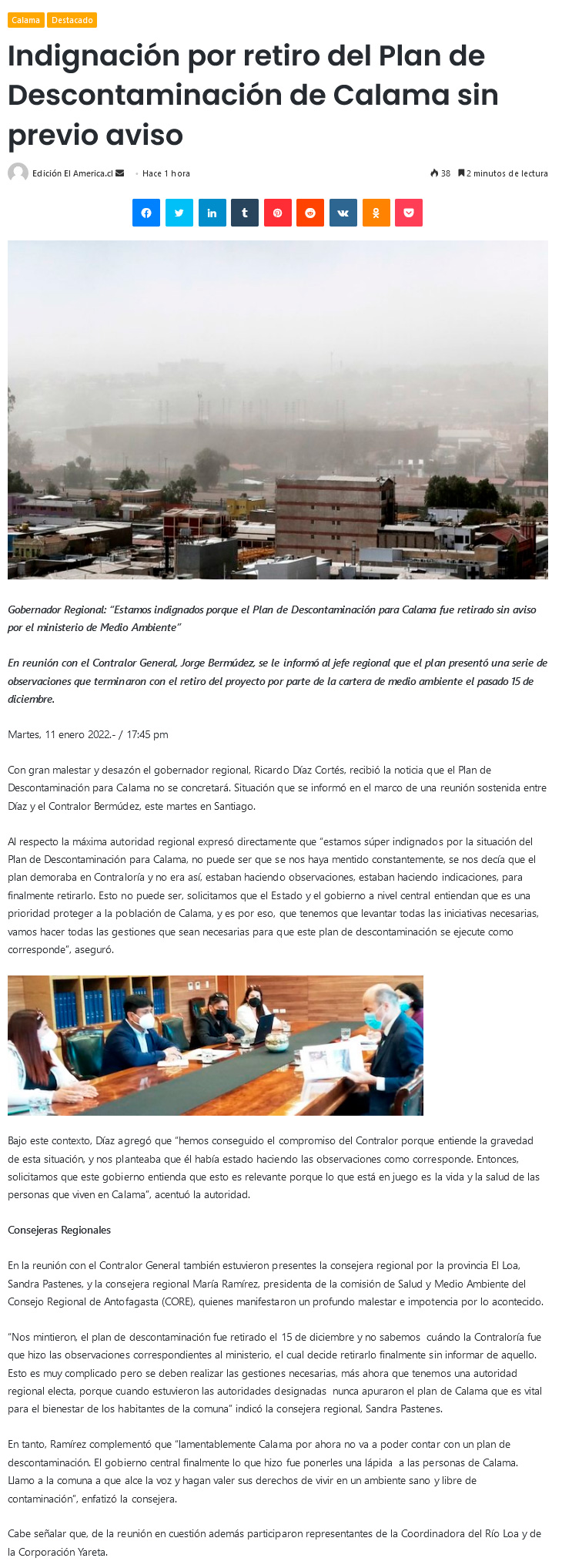 Ministerio de Medio Ambiente retiró de Contraloría el Plan de Descontaminación para Calama (PDA) - (El Mercurio de Calama)