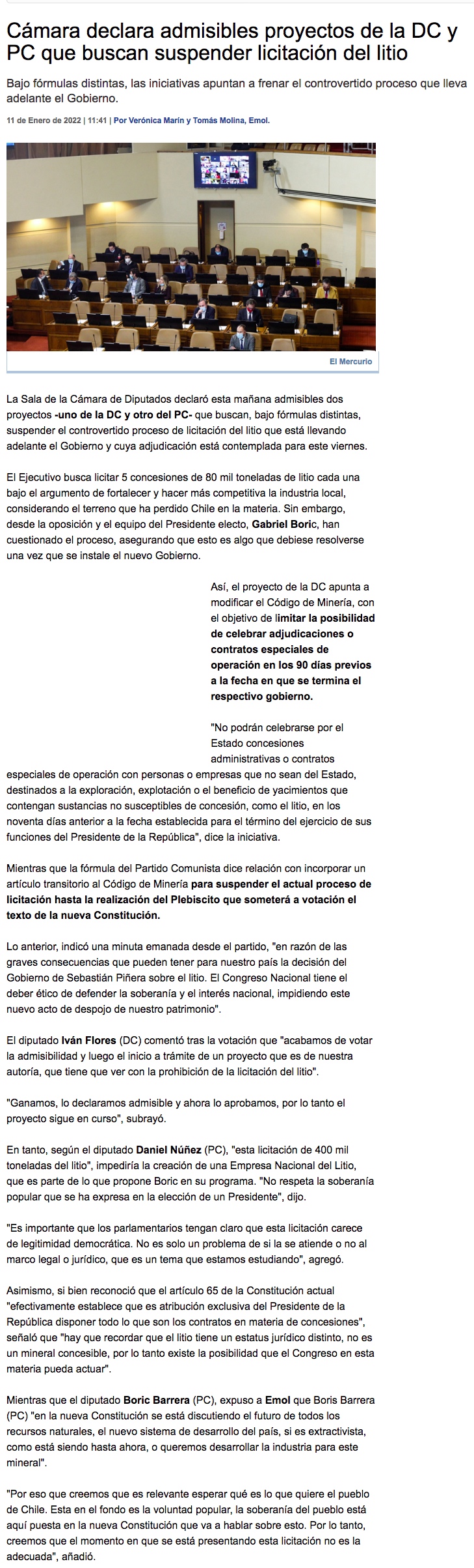 Proyectos que buscan detener licitación del litio avanzan en la Cámara de Diputados - (El Mercurio de Santiago)