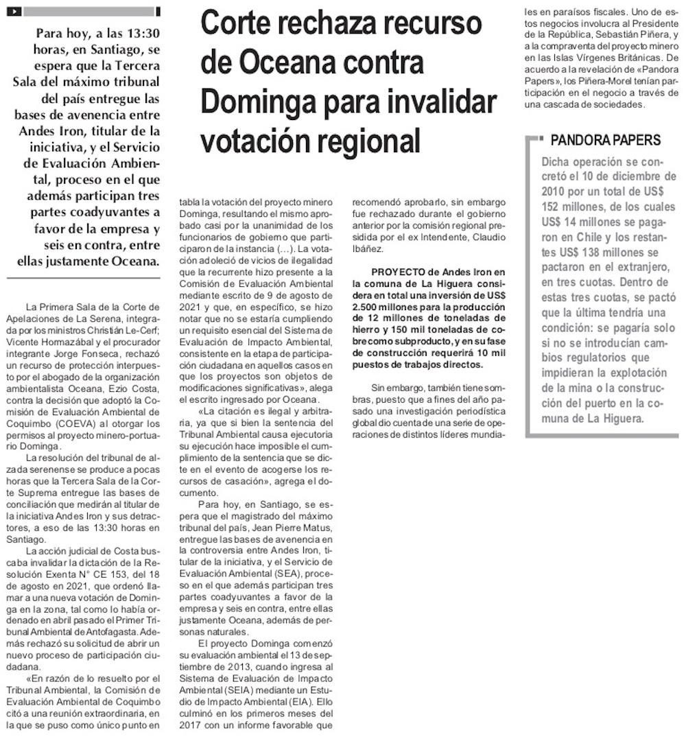 Rechazan recurso de protección contra Coeva a horas de conciliación por Dominga - (El Día)