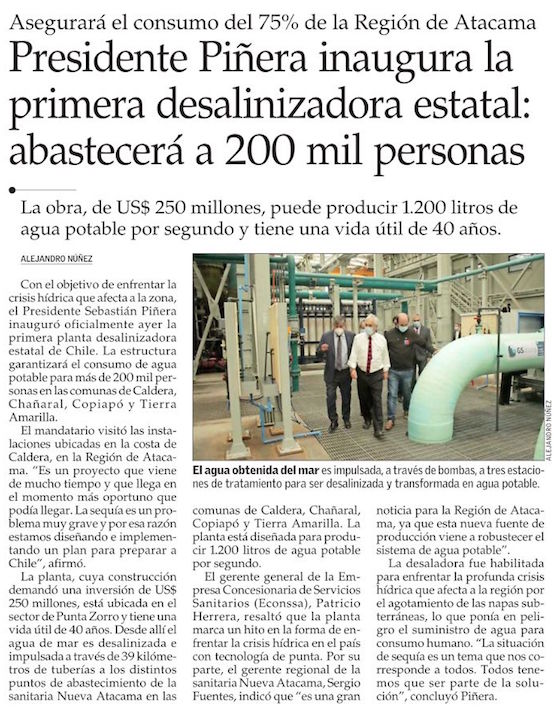 Sebastián Piñera encabeza inauguración de la nueva planta desaladora en Caldera - (El Diario de Atacama)