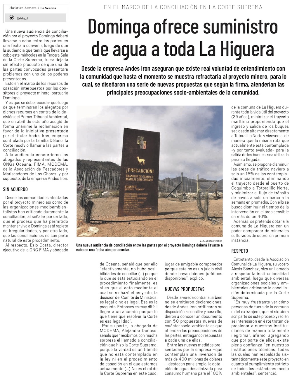 Dominga ofrece agua gratis a la comunidad de La Higuera por 25 años para cerrar conciliación en la Corte Suprema - (Pulso)
