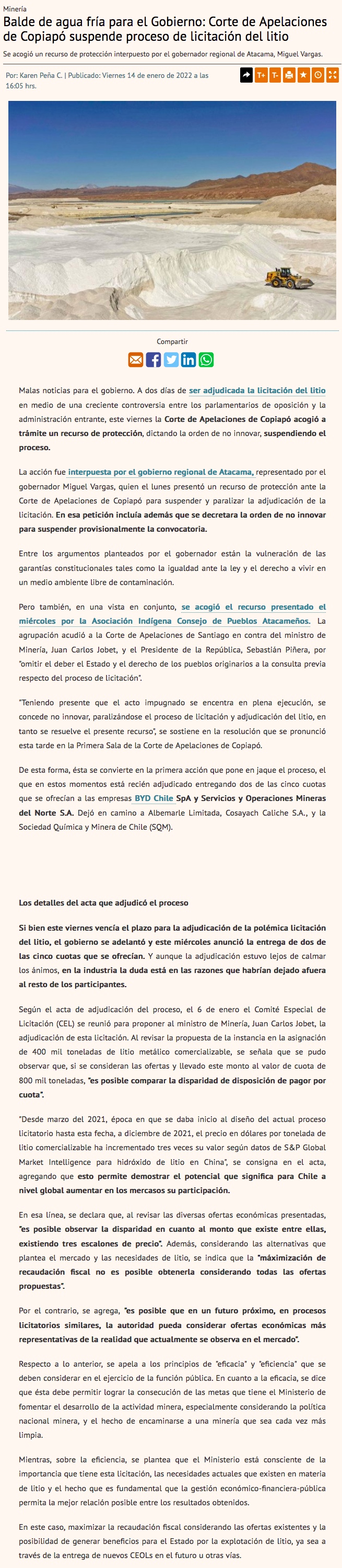 Corte de Apelaciones de Copiapó dicta orden de no innovar y suspende proceso de licitación del litio - (emol)
