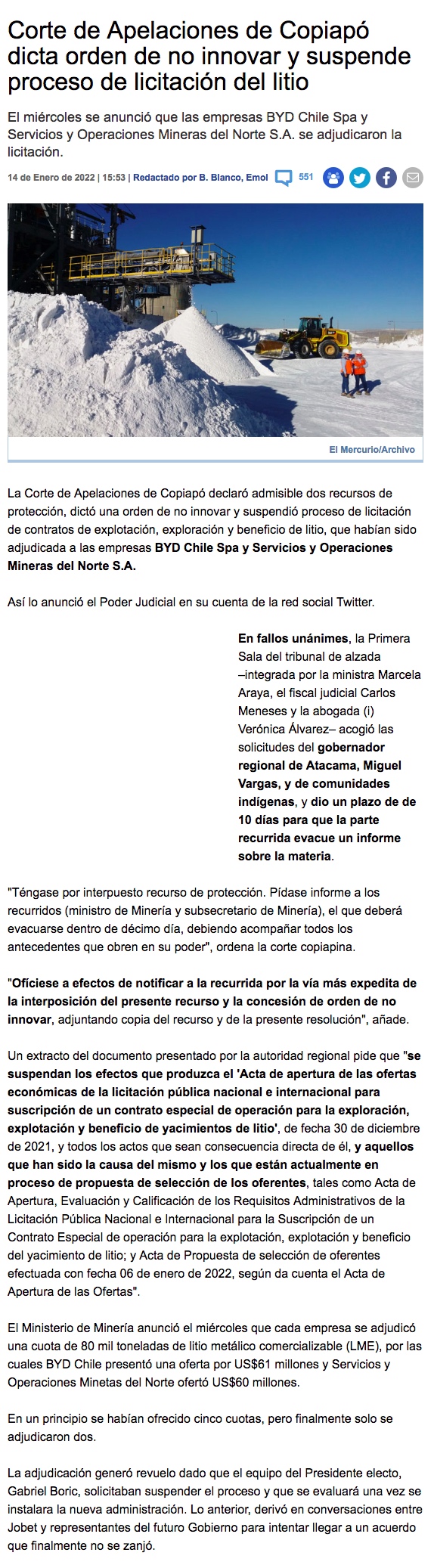 Corte de Apelaciones de Copiapó acoge recurso y frena la licitación del litio - (El Mercurio de Santiago)