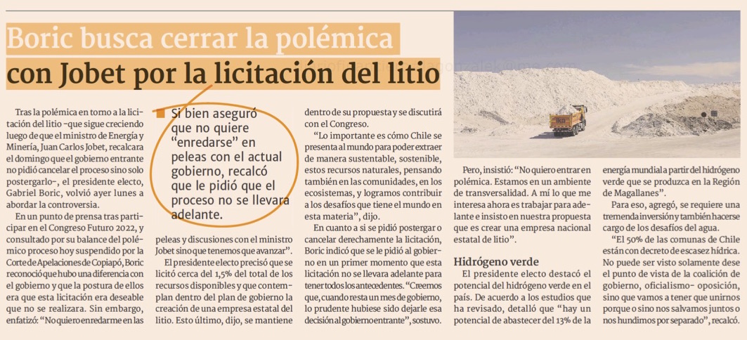 Boric busca dejar atrás polémica e insiste en la empresa nacional del litio - (El Mercurio de Santiago)