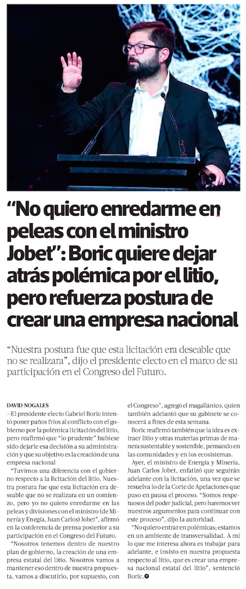Boric busca dejar atrás polémica e insiste en la empresa nacional del litio - (El Mercurio de Santiago)
