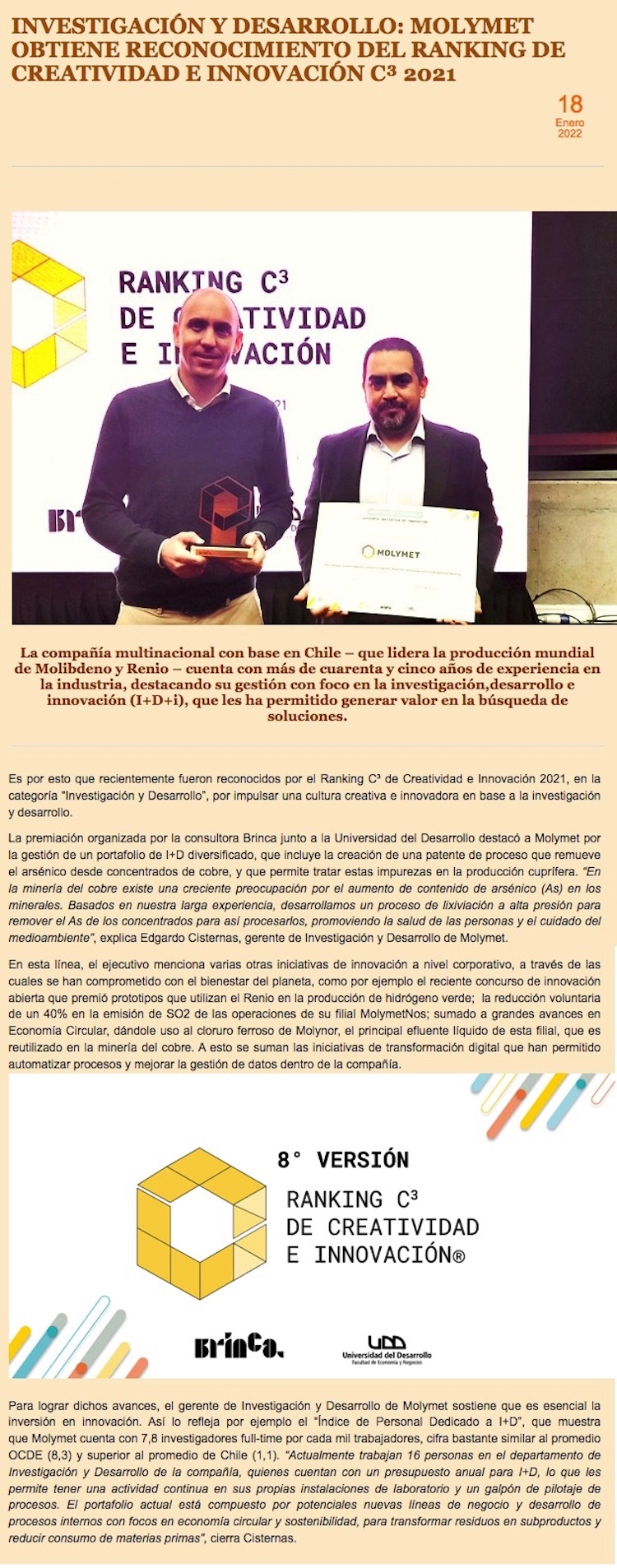 Molymet fue premiada por investigación y Desarrollo - (mch.cl)
