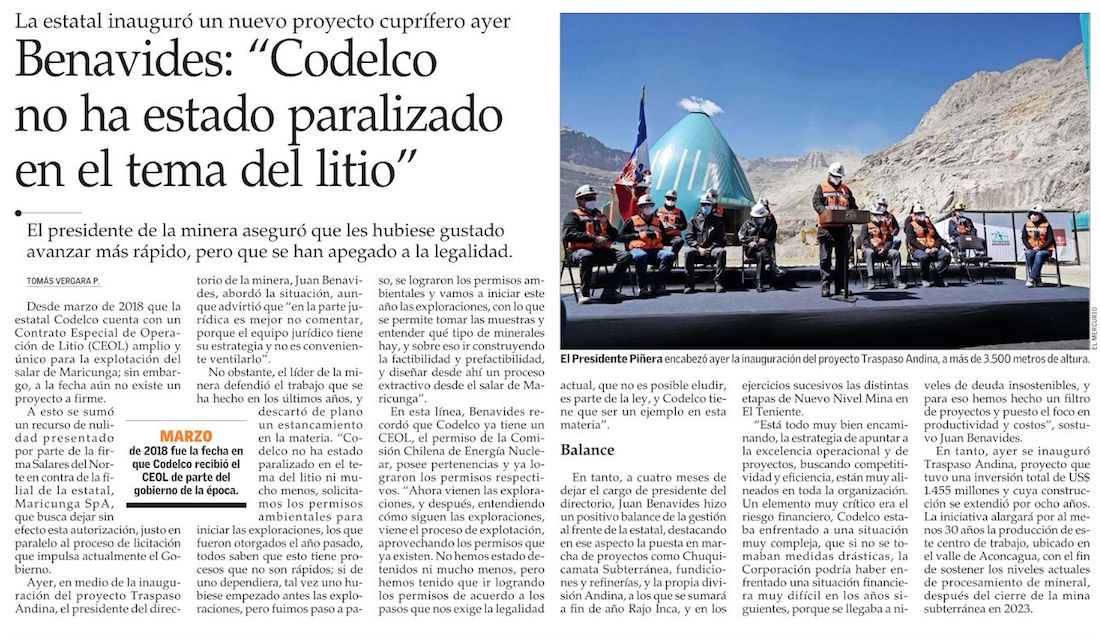 Benavides recalca que en temas de litio Codelco "no ha estado paralizado" y realiza balance de su gestión - (DF Online)