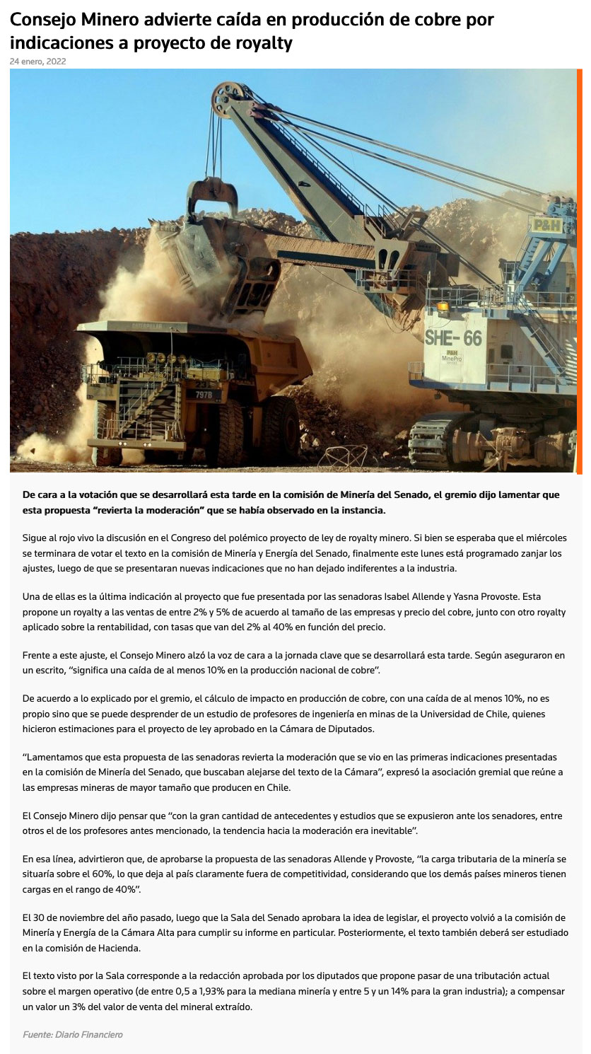 Consejo Minero estima en 10% caída en producción de cobre si se aprueba el nuevo royalty - (chilesustentable.net)