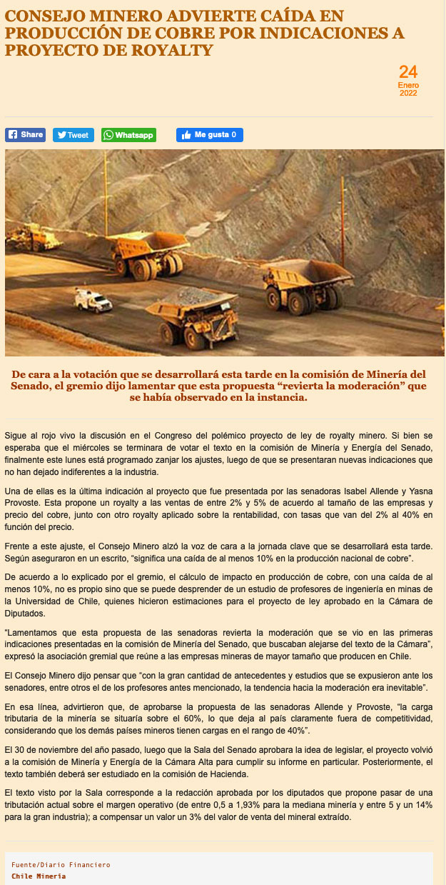 Consejo Minero estima en 10% caída en producción de cobre si se aprueba el nuevo royalty - (chilesustentable.net)