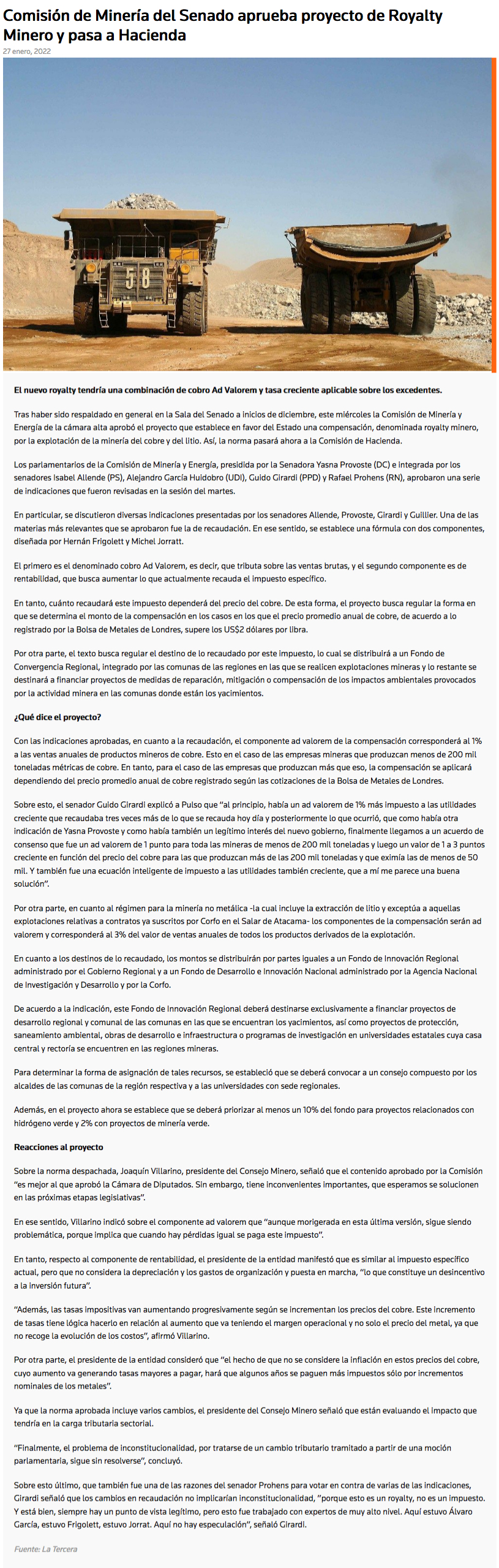 Comisión de Minería del Senado aprueba proyecto de Royalty Minero - (eldiariodesantiago.cl)