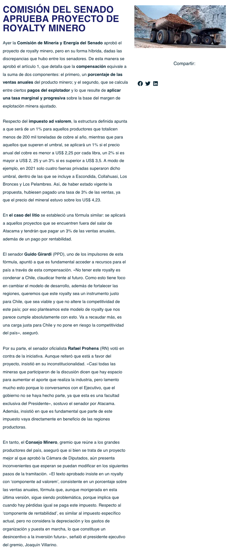 Comisión de Minería del Senado aprueba proyecto de royalty minero y pasa a Hacienda - (chilemineria.cl)