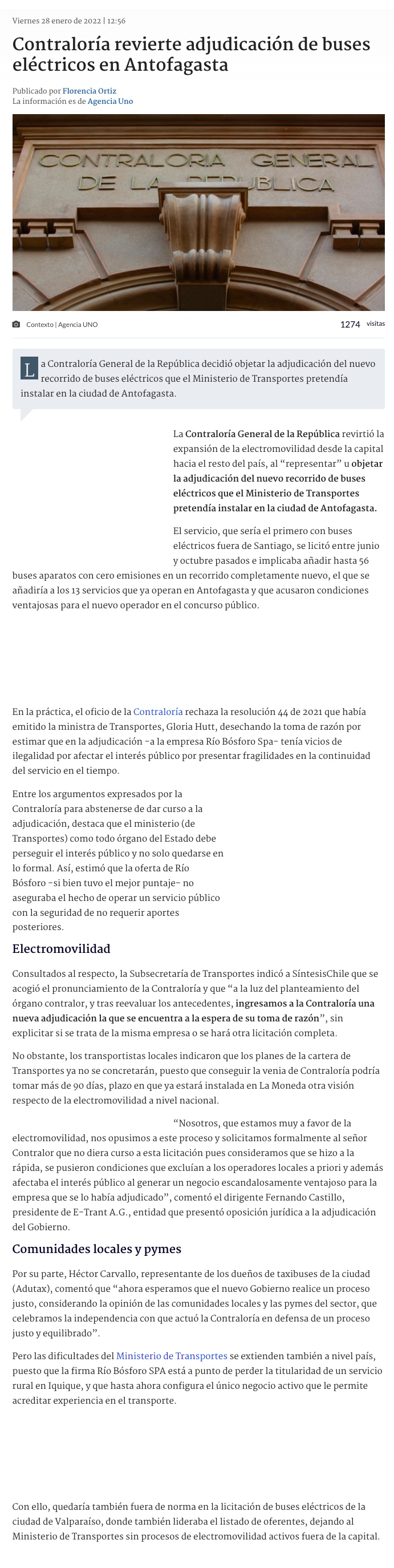 Contraloría revoca adjudicación de buses eléctricos para el transporte público de la ciudad - (El Mercurio de Antofagasta)