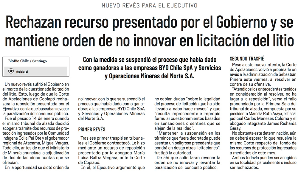 Corte de Apelaciones rechazó recursos de reposición del Gobierno y licitación del litio seguirá suspendida - (El Diario de Atacama)