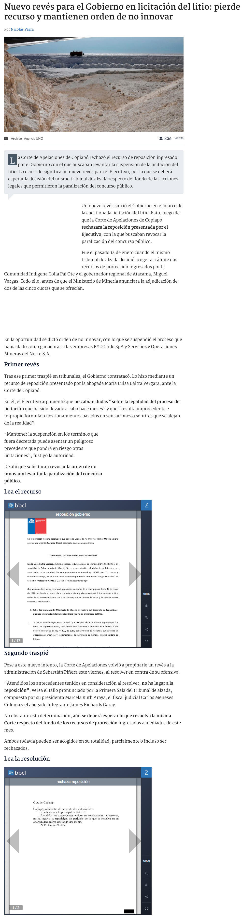 Corte de Apelaciones rechazó recursos de reposición del Gobierno y licitación del litio seguirá suspendida - (El Diario de Atacama)