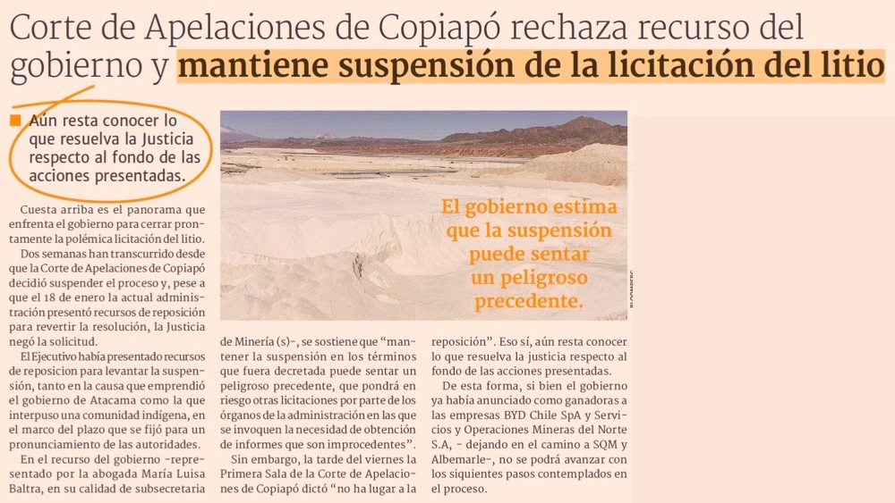 Corte rechaza reposición del Gobierno en licitación del litio - (El Mercurio de Santiago)