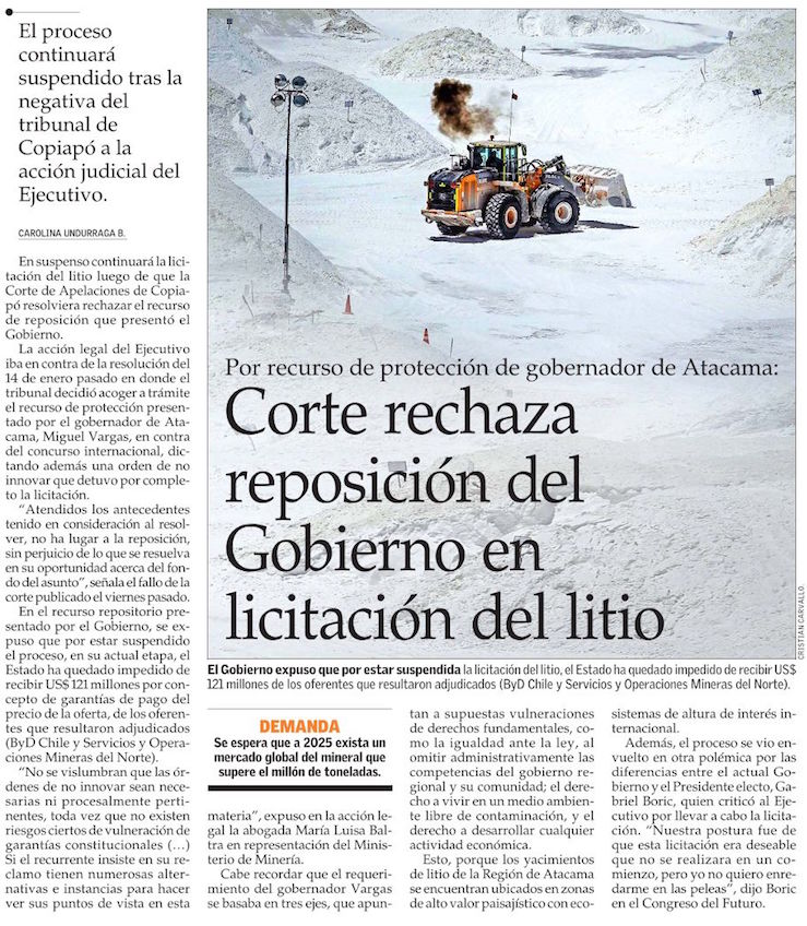 Corte de Apelaciones de Copiapó rechaza recurso del gobierno y mantiene suspensión de la licitación del litio - (Diario Financiero)
