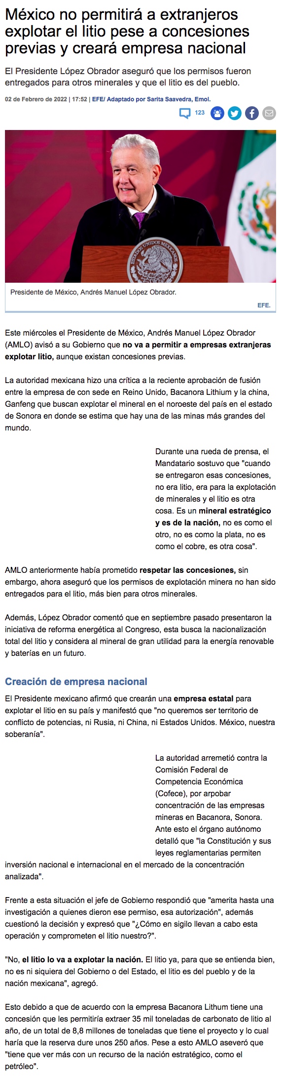 México: AMLO no permitirá a empresas extranjeras explotar litio pese a concesiones previas - (biobiochile online)