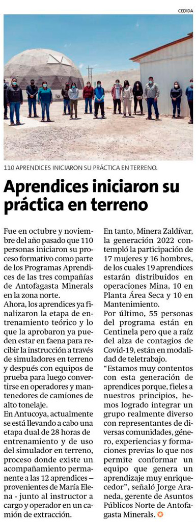 Aprendices de Antofagasta Minerals iniciaron su fase práctica en terreno - (diarioantofagasta)