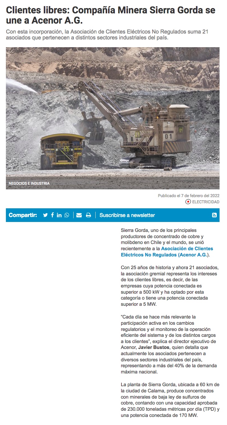 Compañía minera Sierra Gorda se une a ACENOR - (mch.cl)