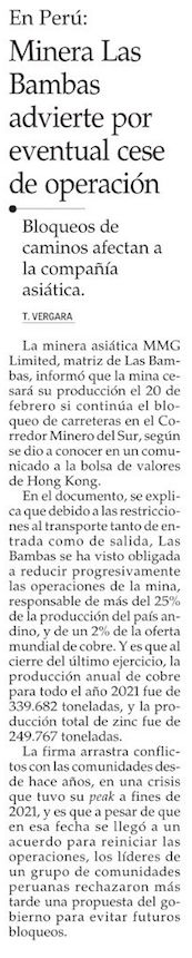 Sube tensión en Las Bambas: minera alerta que podría dejar de operar este mes - (Diario Financiero)