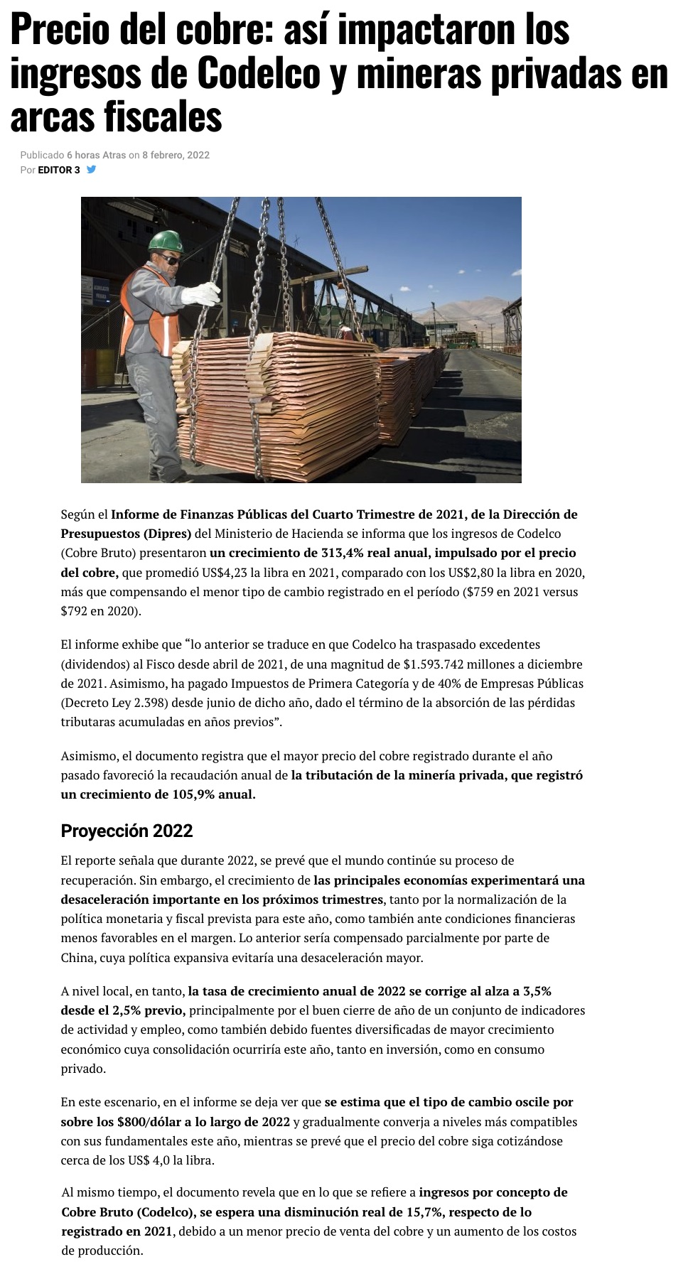Proyectan que libra de cobre promediará una cotización de US$3,95 durante el 2022 - (El Mercurio de Antofagasta)