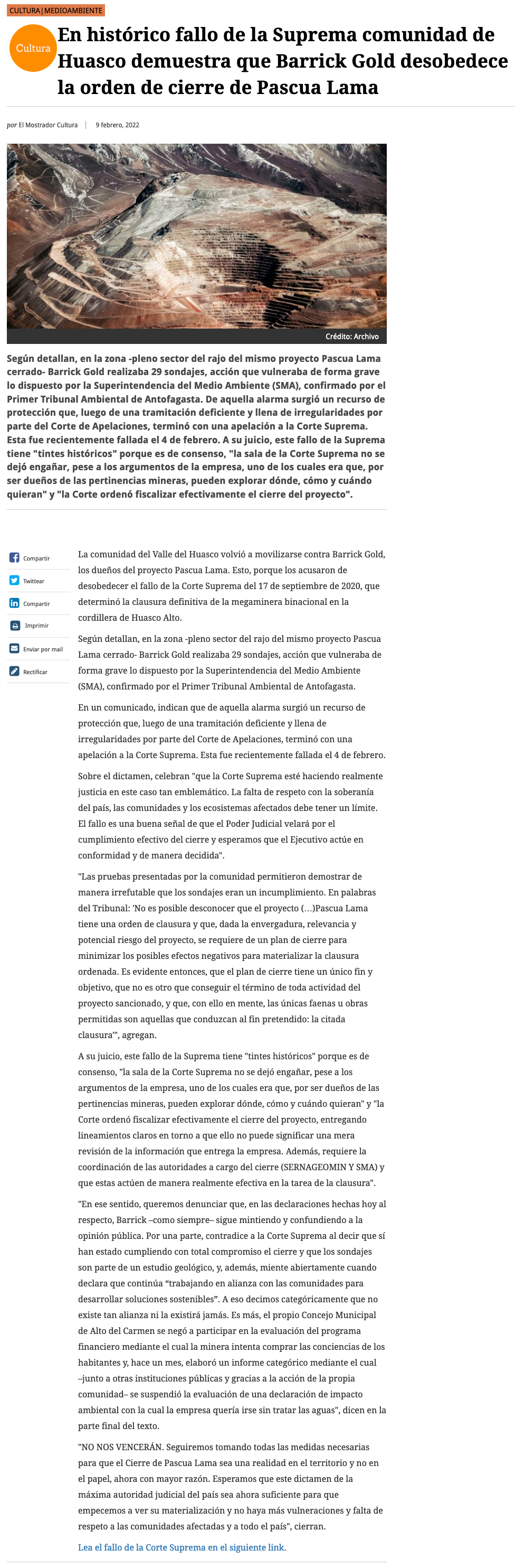 Corte Suprema ordenó fiscalizar incumplimientos al plan de cierre de Pascua Lama - (El Diario de Atacama)