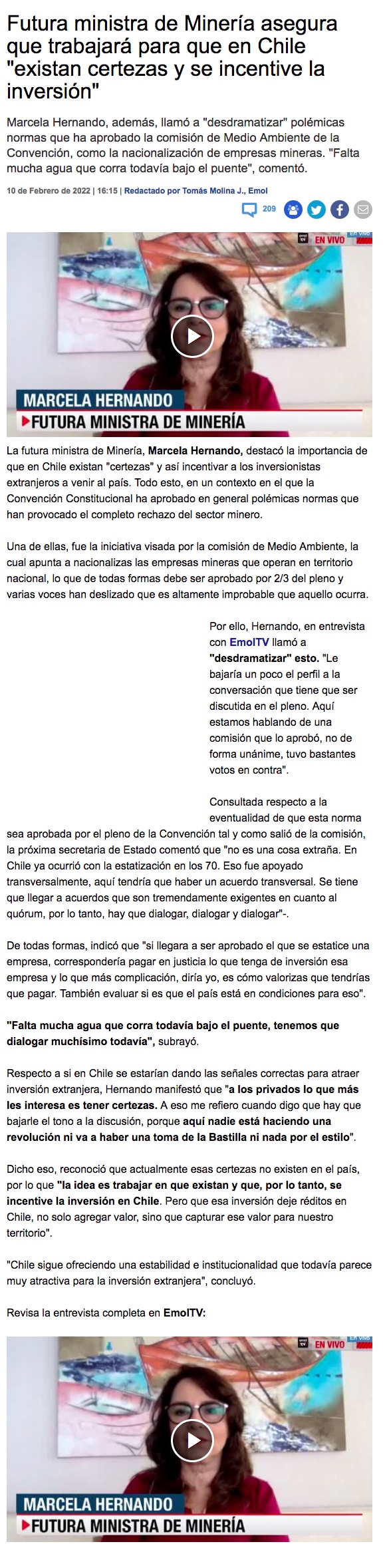 Futura ministra de Minería sobre estatización: “Hay que evaluar si el país está en condiciones de hacer eso” - (El Mercurio de Santiago)