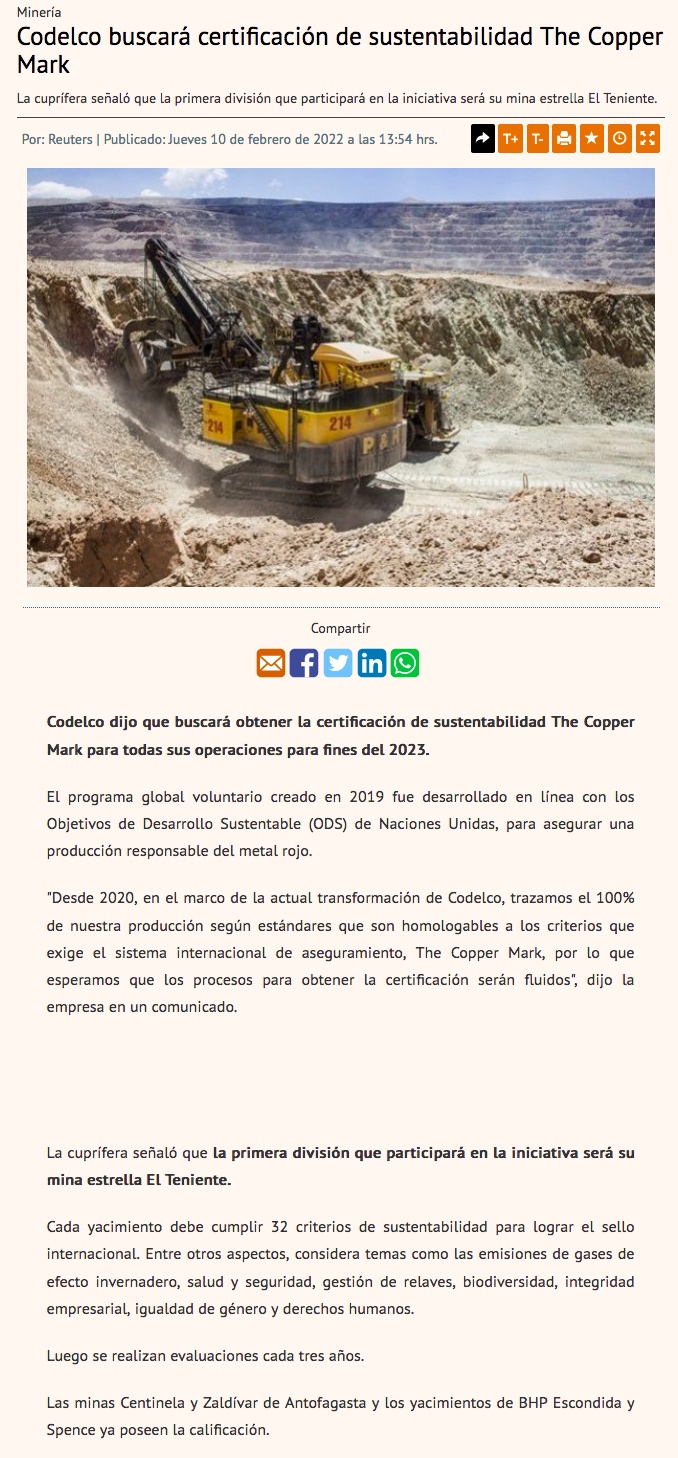Actor clave de la industria se incorpora a The Copper Mark - (mch.cl)