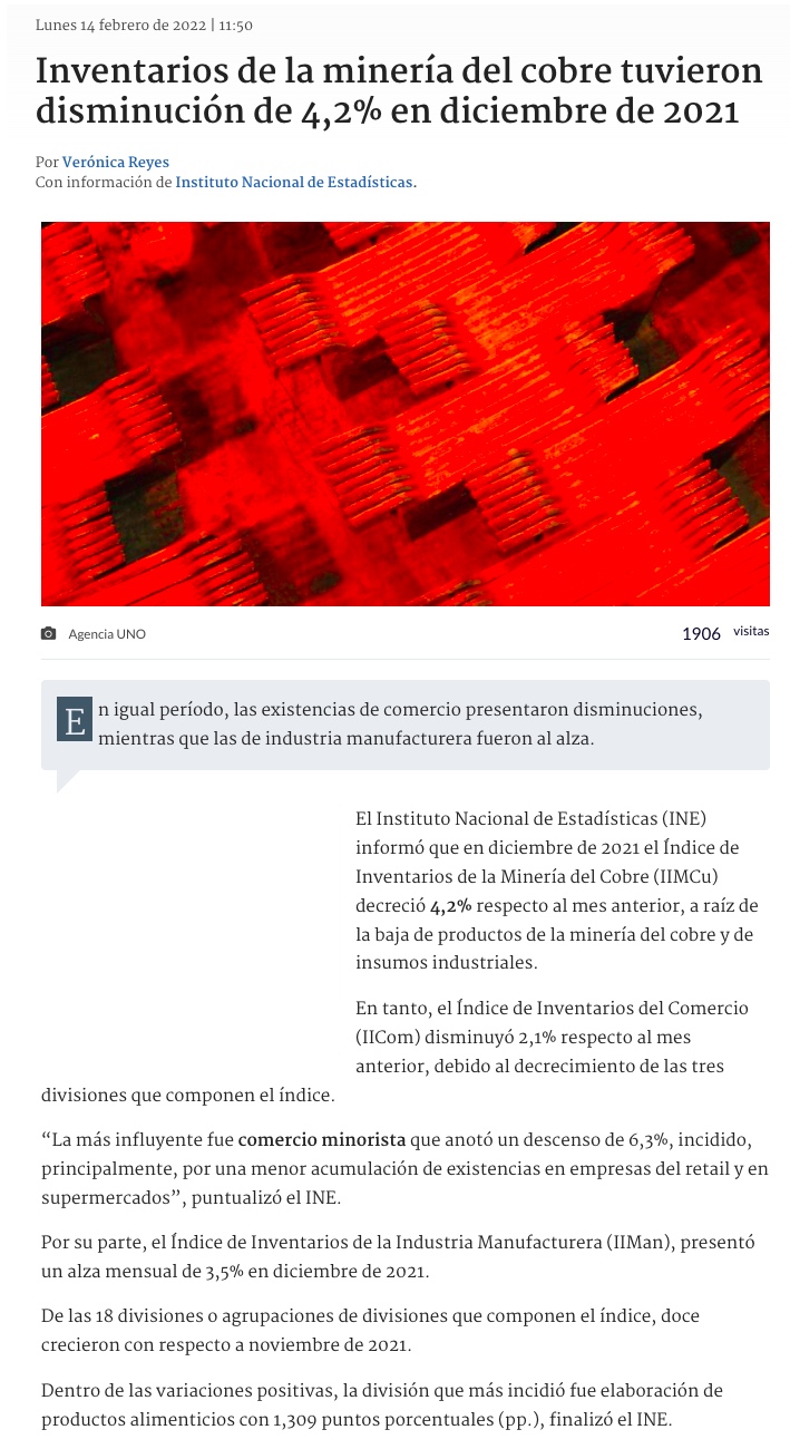 INE: Inventarios de la minería del cobre anotaron disminución mensual de 4,2% en diciembre de 2021 - (mch.cl)