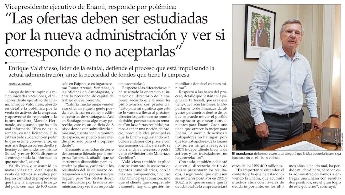 Licitación en Enami activó intensas reuniones y estatal asegura que venta será definida por nuevo directorio - (Diario Financiero)