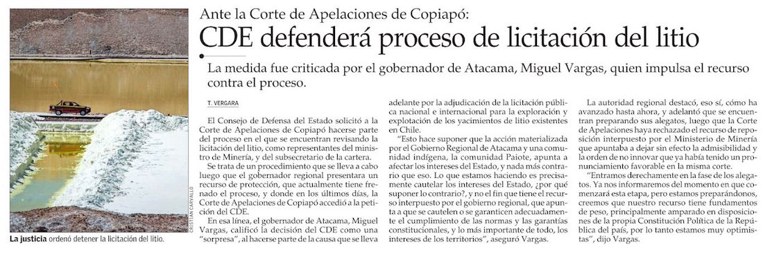 CDE representa al gobierno en causa que suspendió licitación del litio y desata críticas de autoridad de Atacama - (Diario Financiero)