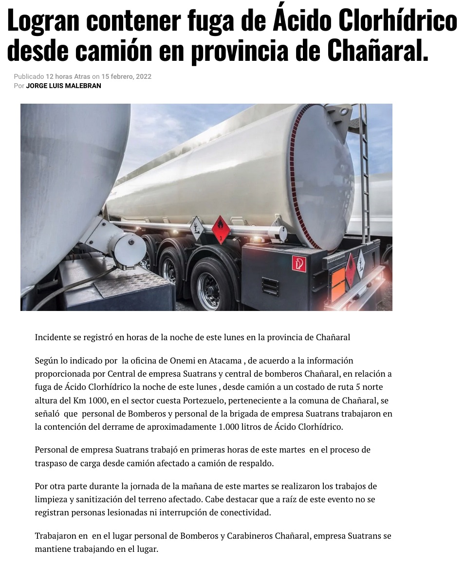 Fuga en camión termina con cerca de mil litros de ácido clorhídrico en la Ruta 5 - (El Diario de Atacama)