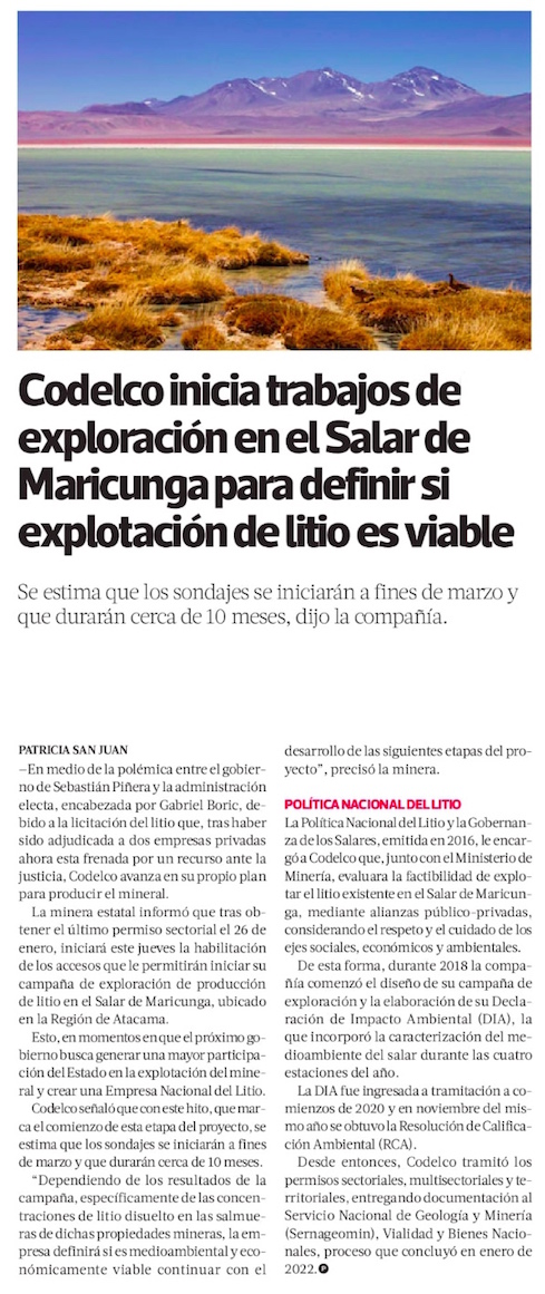 Estatal Codelco iniciará las obras de exploración de litio en el salar de Maricunga - (El Mercurio de Santiago)