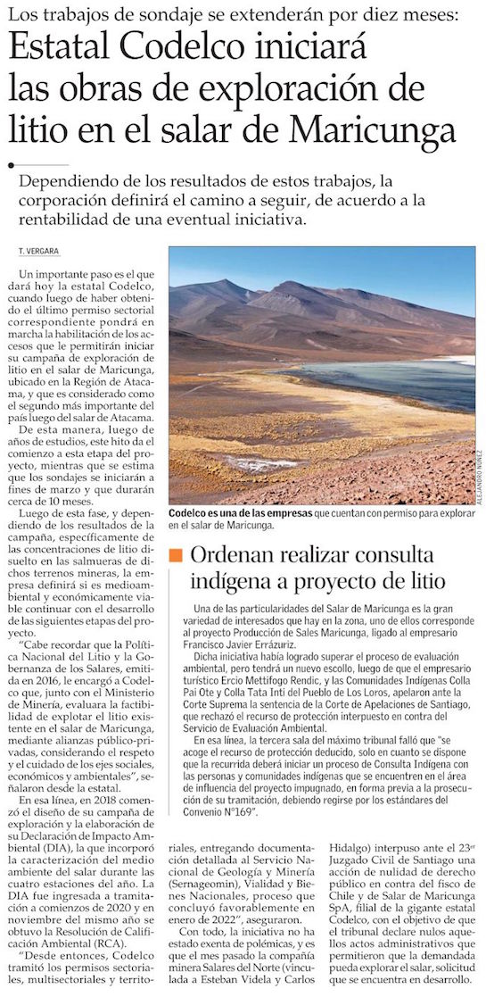 Codelco inicia trabajos de exploración en el Salar de Maricunga para definir si explotación de litio es viable - (Pulso)