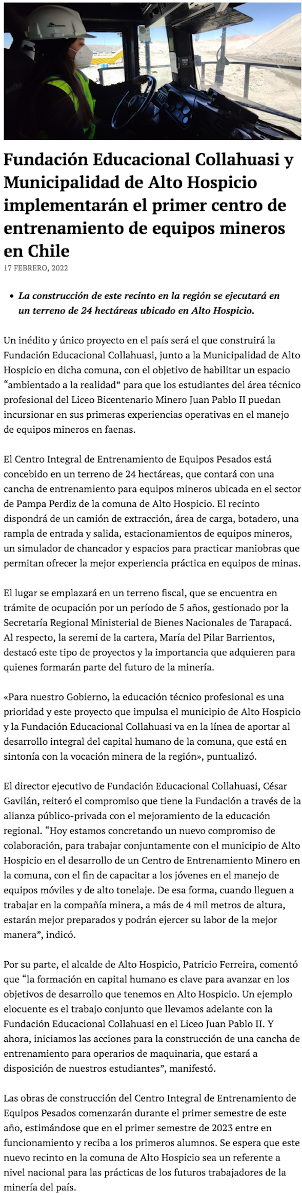 Fundación Educacional Collahuasi y Municipalidad de Alto Hospicio implementará el primer centro de entrenamiento minero en Chile - (El Longino de Iquique)