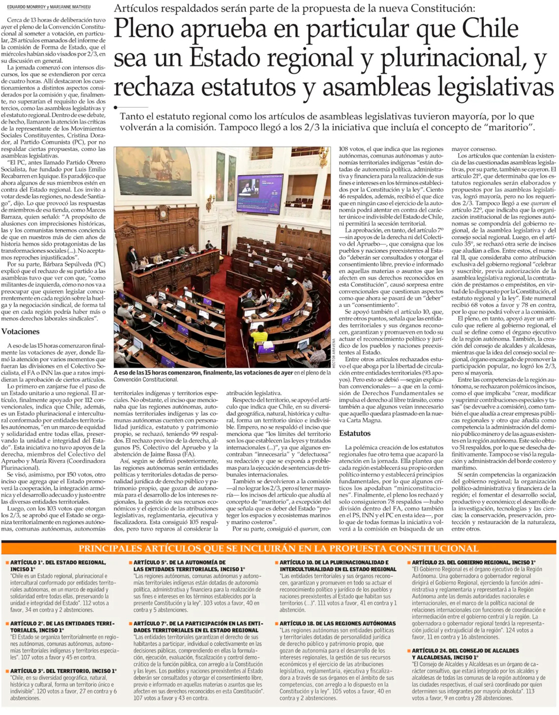 "Convención aprueba que Chile es Estado regional y plurinacional - (La Tercera)