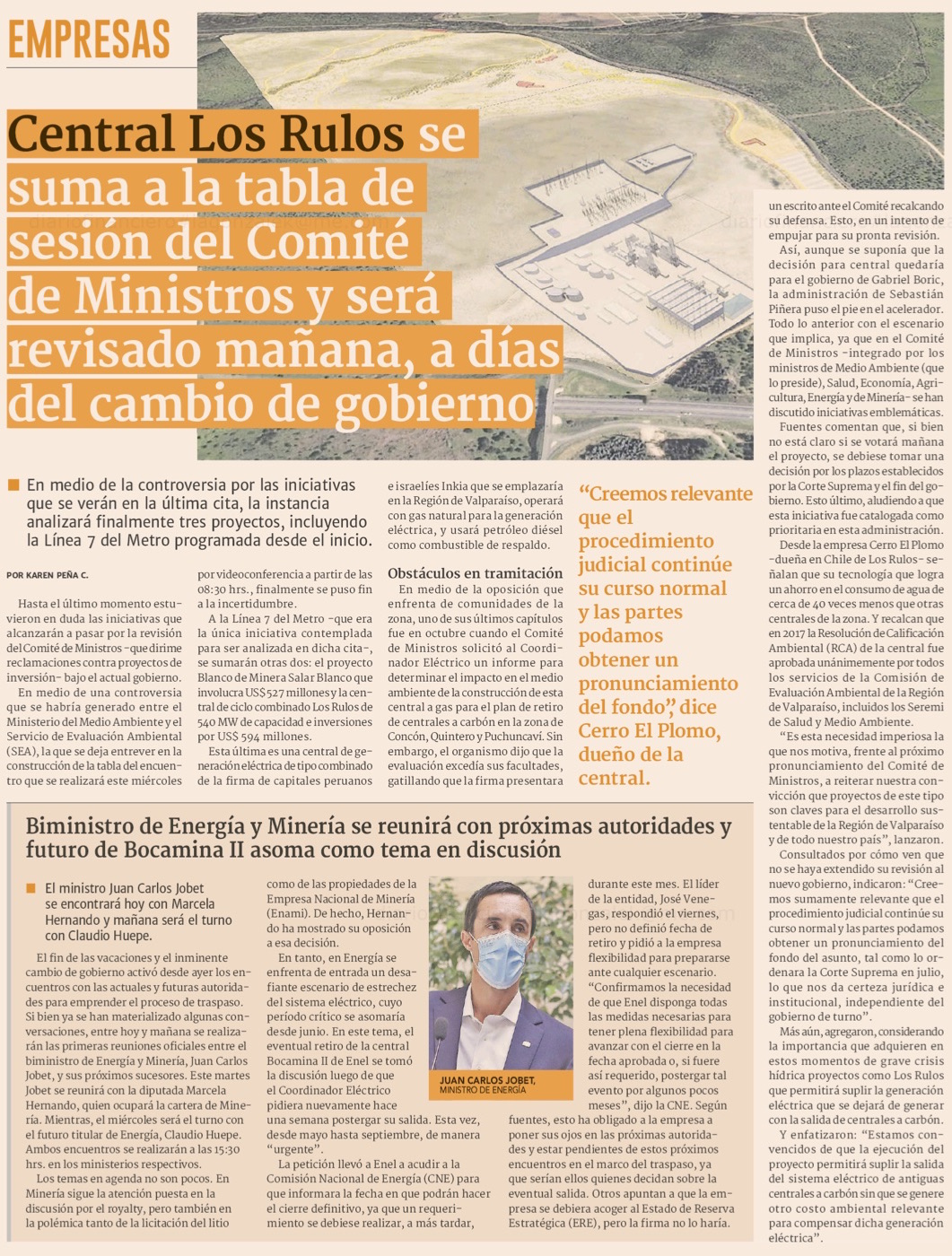 Gobierno repone el proyecto de termoeléctrica Los Rulos en la tabla de hoy del Comité de Ministros - (El Mercurio de Valparaíso)