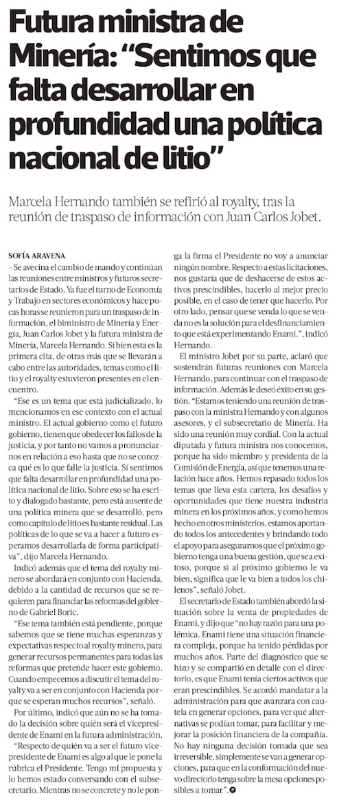 Hernando esperará la justicia para pronunciarse sobre licitación del litio y raya la cancha por Enami - (Diario Financiero)